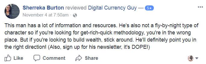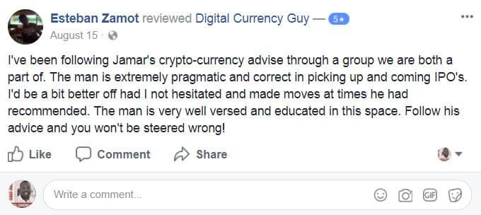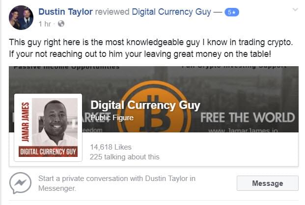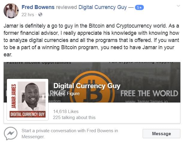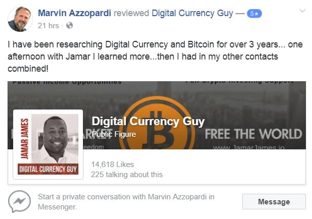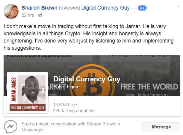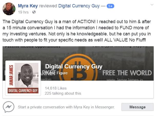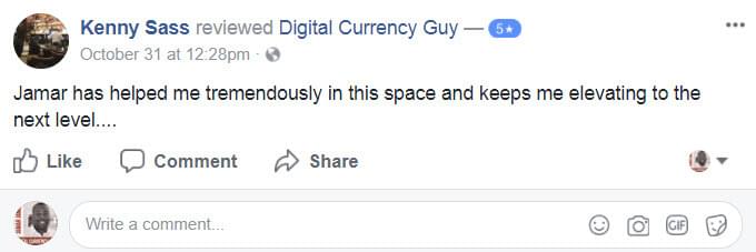 Jamar, also known as the Digital Currency Guy has created a dynamic coaching group designed to take an individual from being introduced to crypto-currency to living completely off of crypto-currency investments within 12 months.